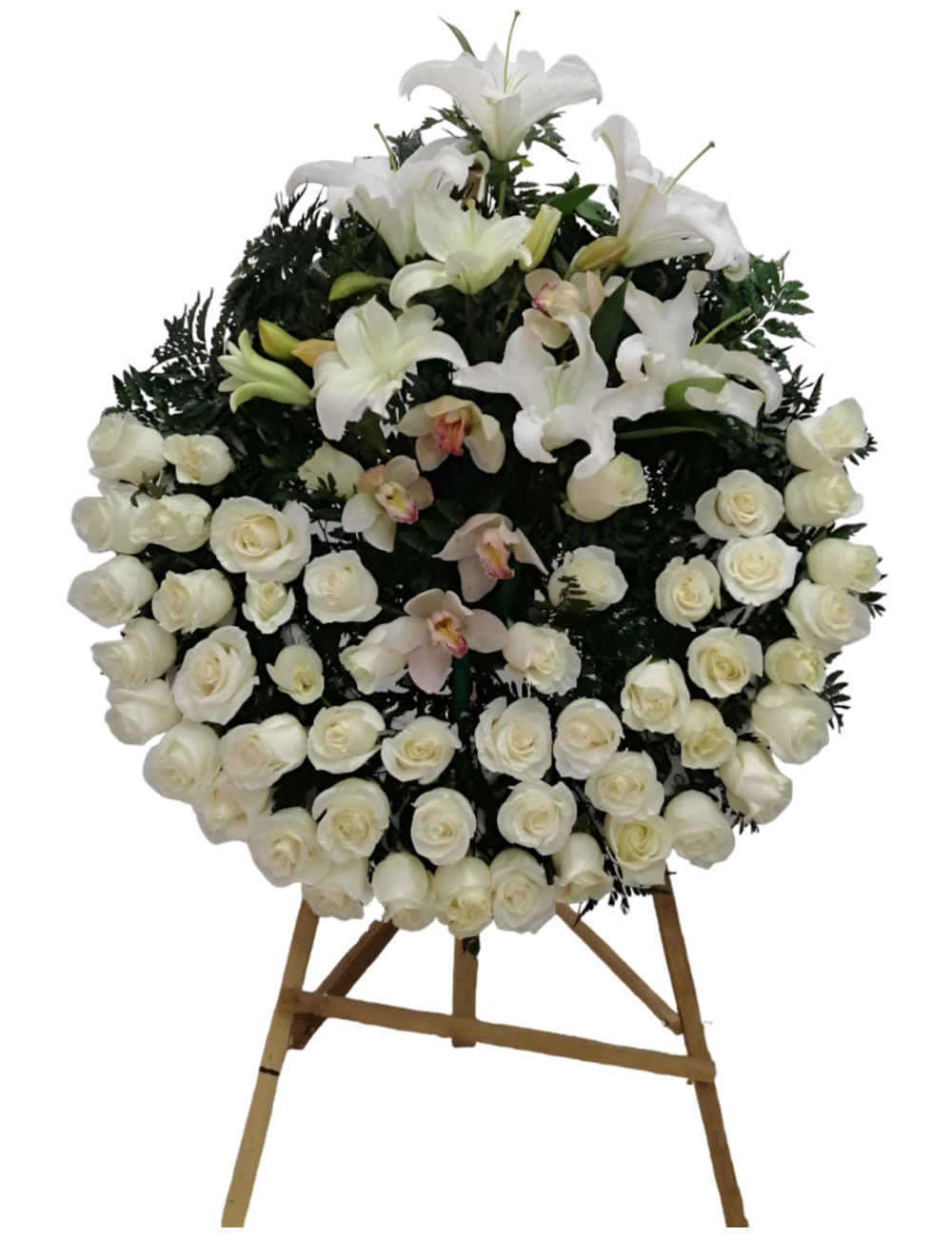 Corona Fúnebre con orquídeas, lirios y rosas a domicilio en Bogotá. Colores sujetos a disponibilidad. Medidas aproximadas 100 de alto x 100 de ancho.