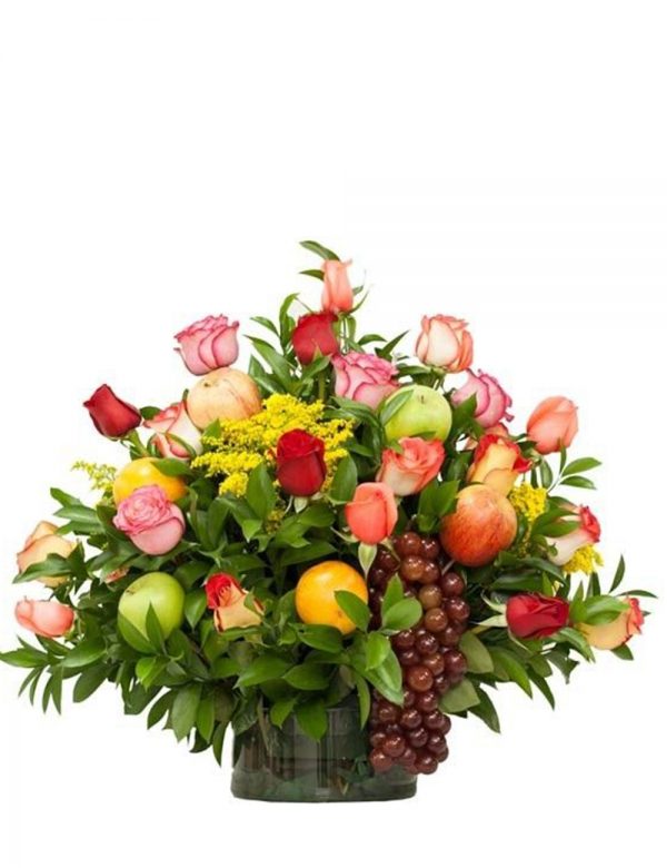 Ramo de Rosas y Frutas,  Redondo con 30 Rosas La Uvita, elaborado con hermosas rosas en colores surtidos, helecho cuero o ruscus y solidago, sobre una delicada base de vidrio. A domicilio en Bogotá. Medidas aproximadas 65cms de alto x 60 de ancho. El color de la rosa de este arreglo floral puede variar según disponibilidad sin afectar la calidad o el diseño de nuestro producto